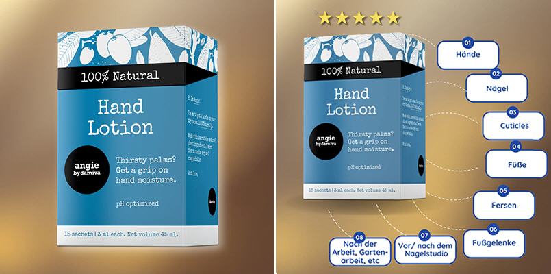 ANGIE – Pflege für beanspruchte Haut. ANGIE wurde speziell für die Pflege von Händen, Nägeln, Nagelhaut und Füßen entwickelt. Die konzentrierte, wasserfreie Rezeptur ist ergiebig, zieht gut ein und sorgt für ein gepflegtes Hautgefühl. Die Formulierung verzichtet auf belastende Zusatzstoffe und eignet sich besonders für empfindliche Haut. Ob im Alltag oder nach besonderer Belastung – ANGIE pflegt trockene, strapazierte Hautpartien und trägt zu spürbarer Geschmeidigkeit bei. >>MEHR ERFAHREN